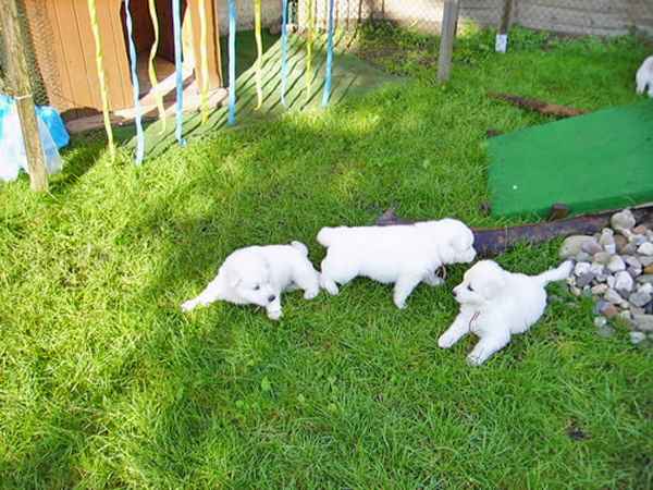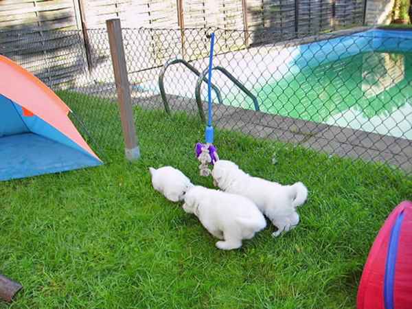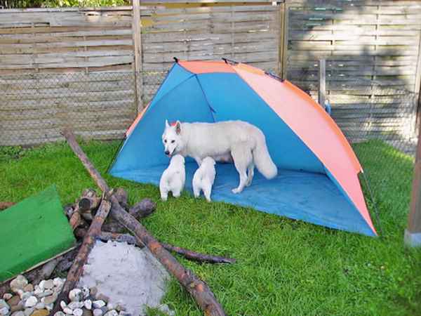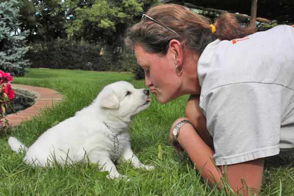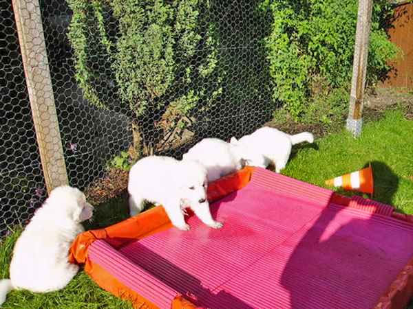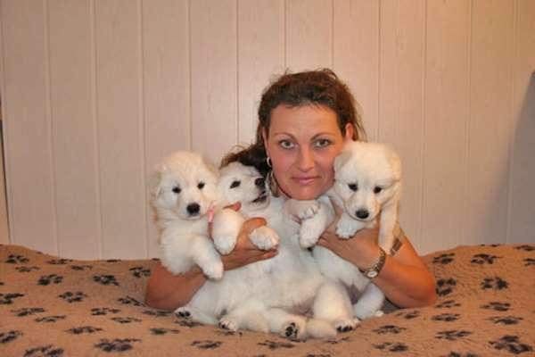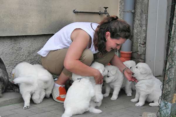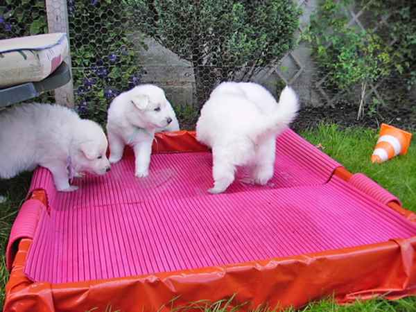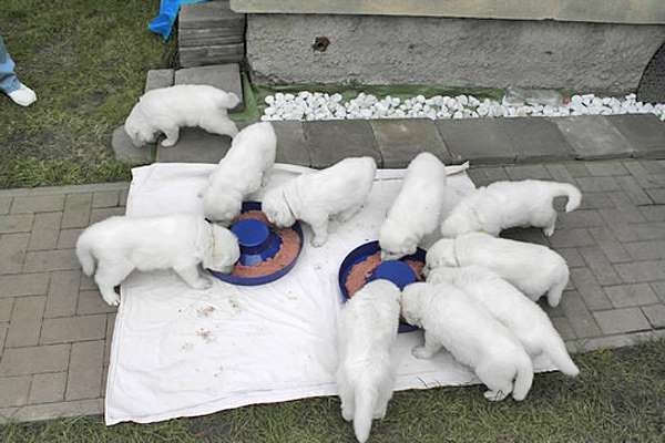 Füttern der weißen Schweizer Schäferhundwelpen |