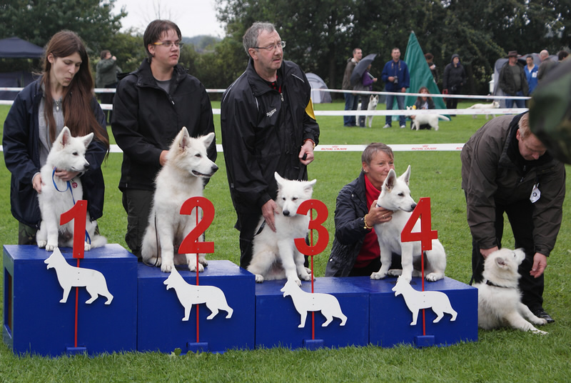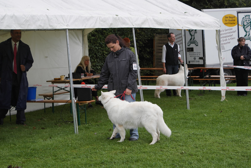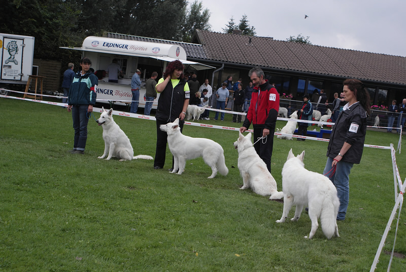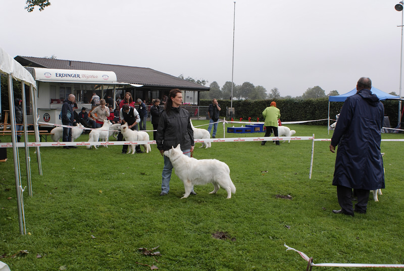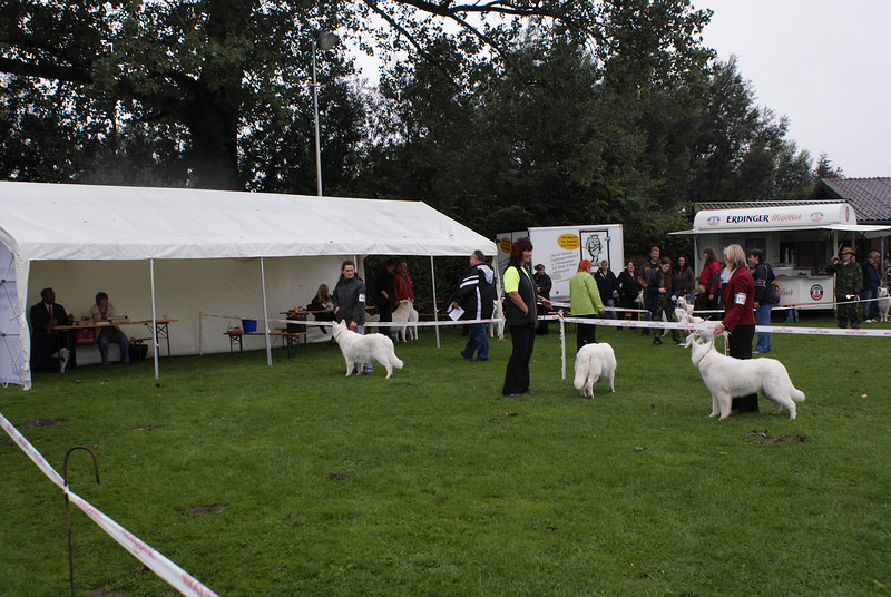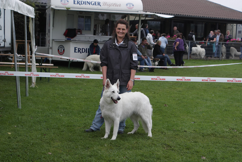 Bundessiegerzuchtschau in Alpen Veen 2011 Am Samstag den 13.08.2011 gab es am Abend ein Essen mit Unterhaltung, zu dem alle Mitglieder Eingeladen waren. Der Abend war sehr schön nur leider hat es später angefangen zu Regnen, was sich dann bis in den Sonntag Mittag hin gezogen hat. Der Tag hat sich dann aber mit Sonnenschein verabschiedet. Wir sind mit denn Ergebnissen Keona Platz 2 in der Veteranen Klasse und Coralie in der Offenen Klasse V 5 ganz zufrieden und konnten am späten Nachmittag in den Urlaub an die Ostsee fahren. Zuvor haben wir noch besuch bekommen von Familie Schmale mit Barkley, die Freude Barkley nach so langer Zeit wieder zusehen war bei ihm genau so groß wie bei uns. Es ist schön immer mal wieder ein Welpen von uns der ausgewachsen ist wieder zu sehen. Deshalb einen großes Dankeschön an Familie Schmale das wir den großen Hasen sehen durften. |