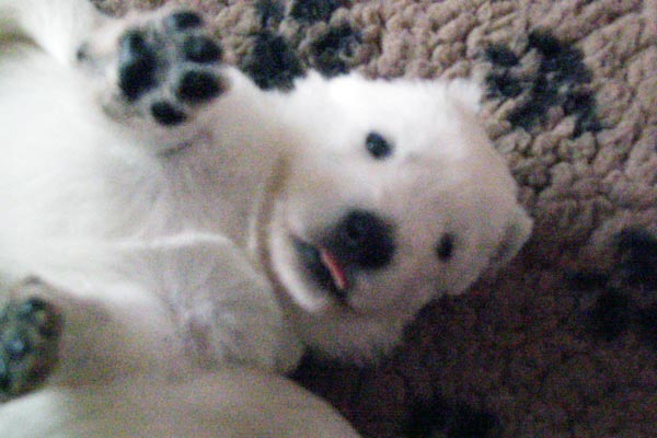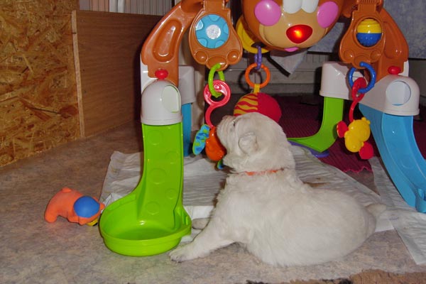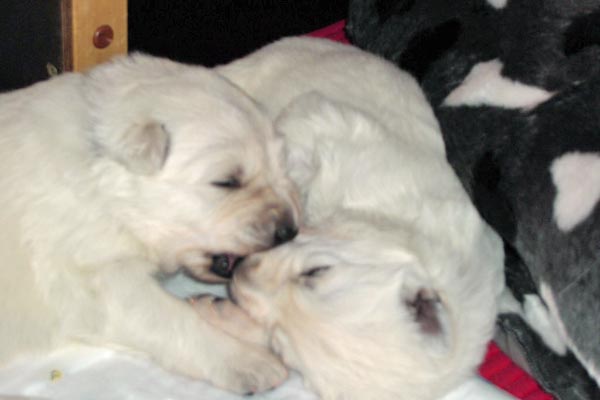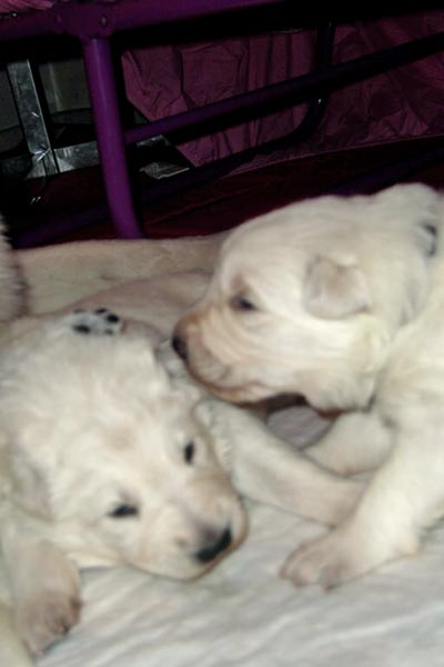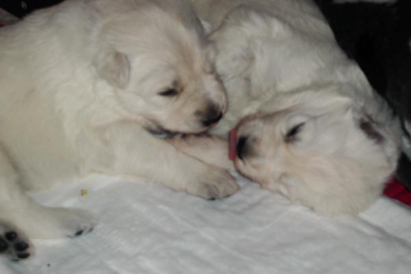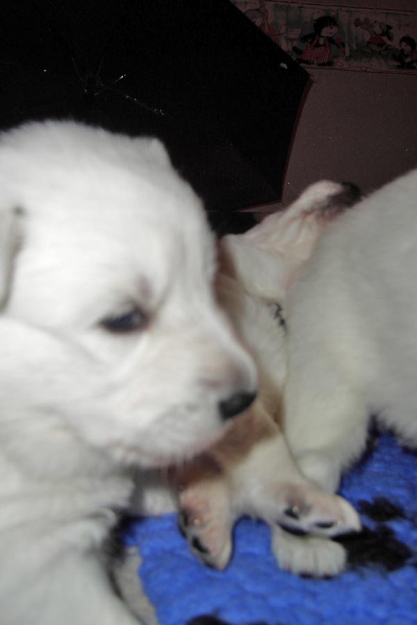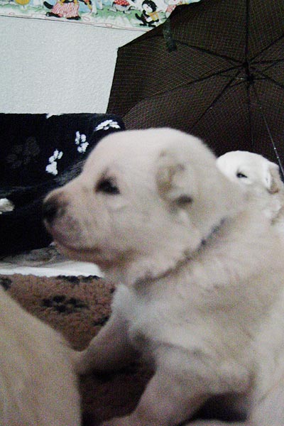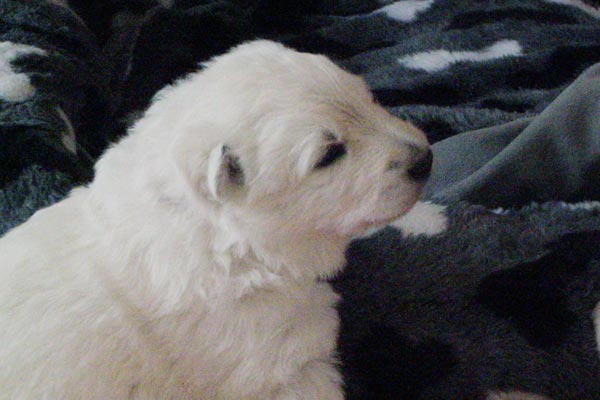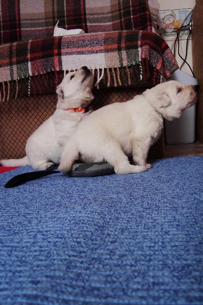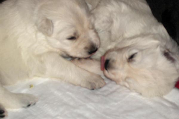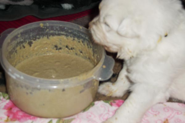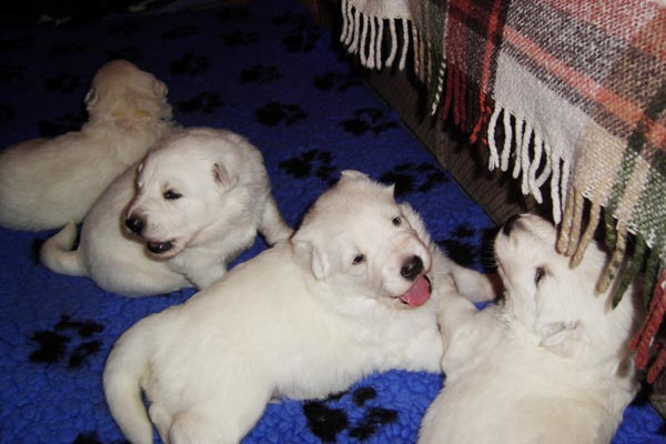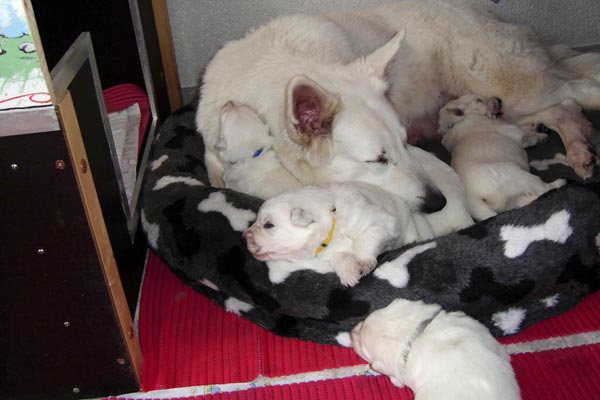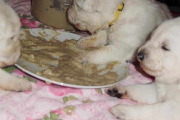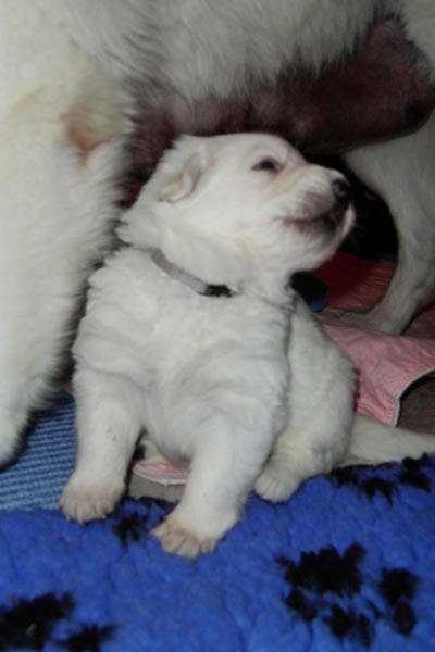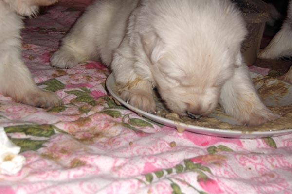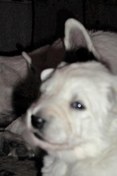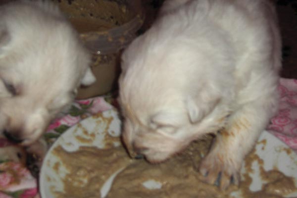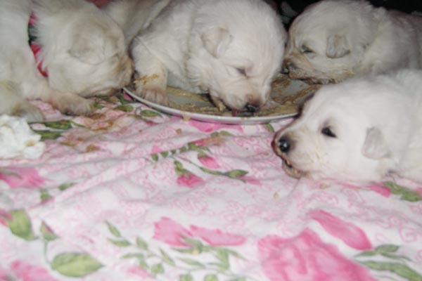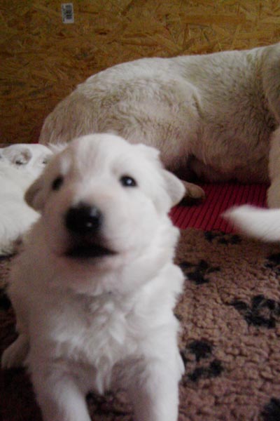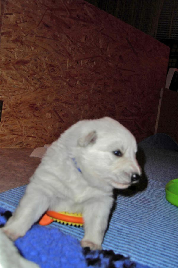 Die Welpen entwickeln sich wunderbar. Sie haben jetzt alle die Augen geöffnet und werden schon ganz schön drollig.Sie necken und spielen schon miteinander,singen (Kopf hoch schnute spitz) huuuuuuu ! wenn die Musik spielt vom Mopoli. Es ist lustig das zu hören. Brei gab es auch schon,wie man auf den Bildern sehen kann hat es allen gut geschmeckt.
