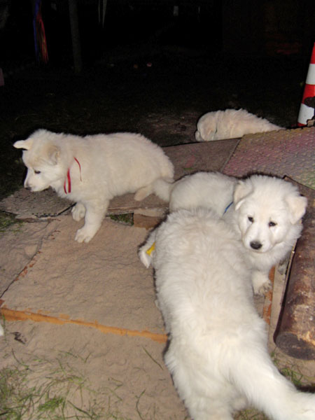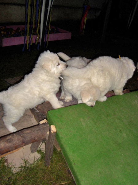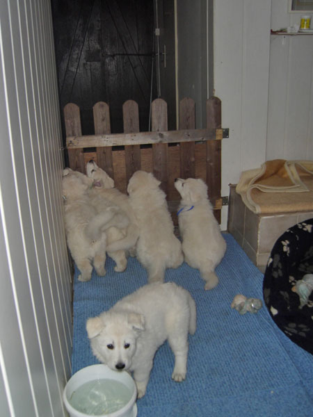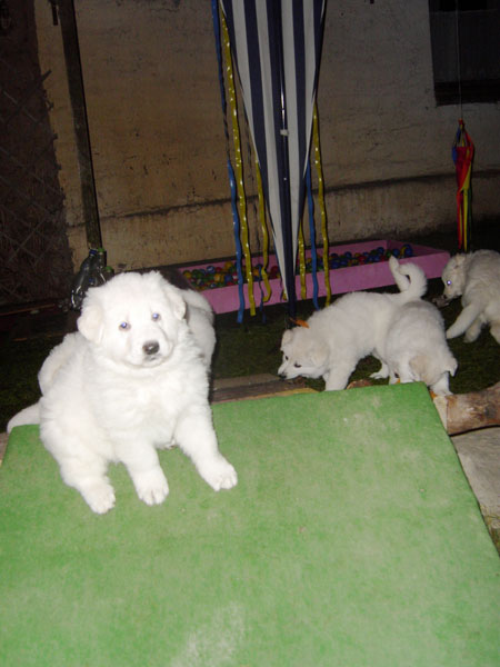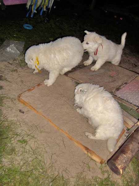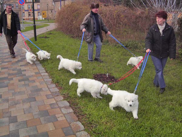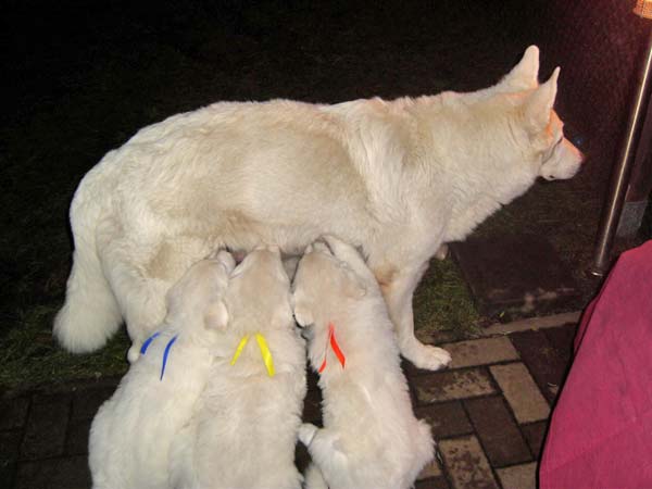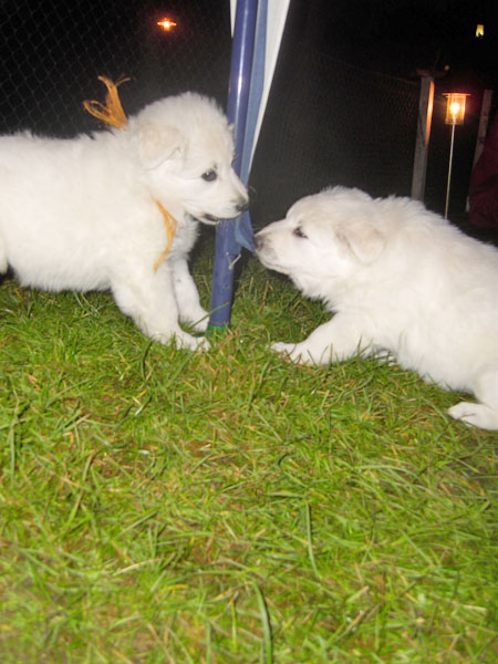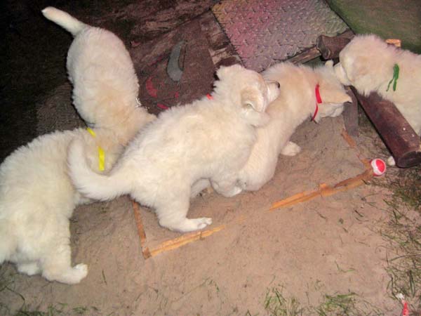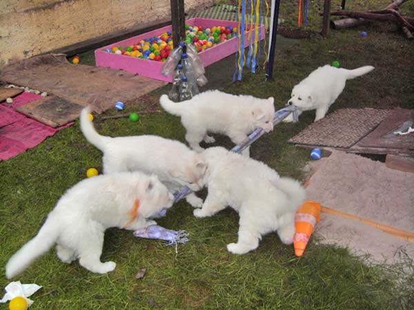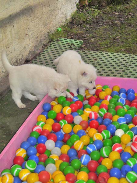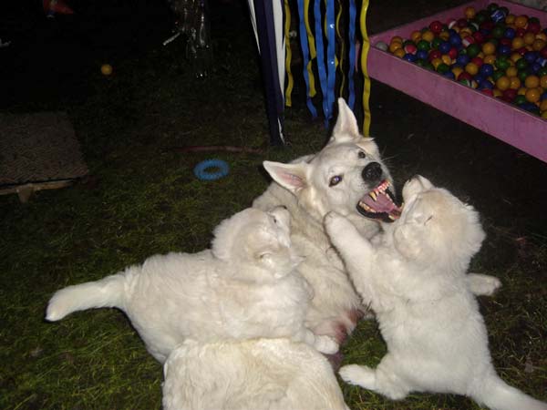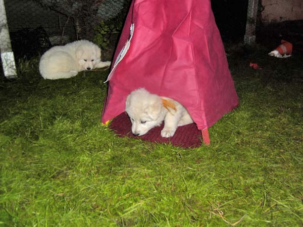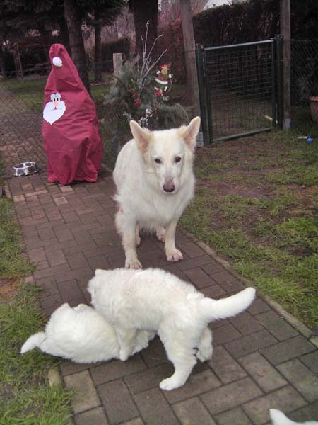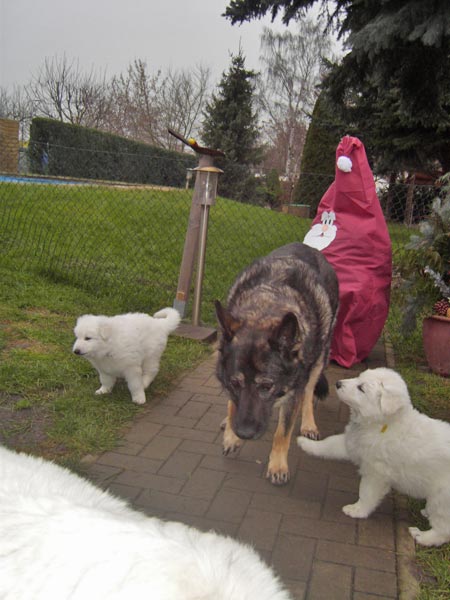 Wau und wieder ist eine Woche um. Wir fühlen uns alle sehr wohl. Spielen im Garten ist jetzt unser Motto. Balou paßt auf uns auf, spielen will er leider nicht mit uns, aber wir haben ja Enza und Mama. Ein erstes Ohr steht und wir wollen nicht mehr im Zimmer bleiben. Raus - raus - raus. Das durften wir auch jetzt, an der Leine konnten wir viele Autos neue Leute und auch Hunde kennenlernen, die nicht in in unser Rudel gehören. Das war vieleicht aufregend. Kinderbesuch war auch da. Also dann bis nächste Woche. Wau Keona und das Rudel