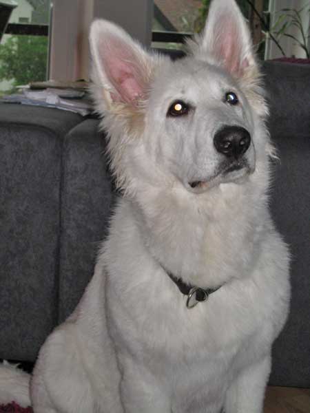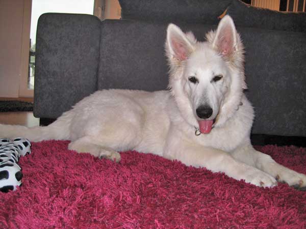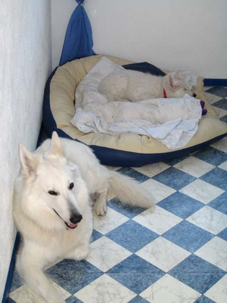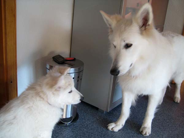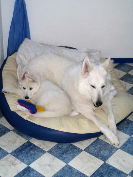 Chiara hat sich schon sehr gut eingelebt. Nachts ist sie wirklich ruhig aber tagsüber hält Sie uns gut auf Trab... Mit Spike vertseht sie sich auch gut... |