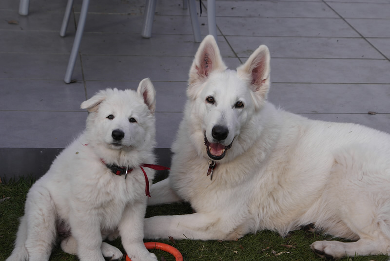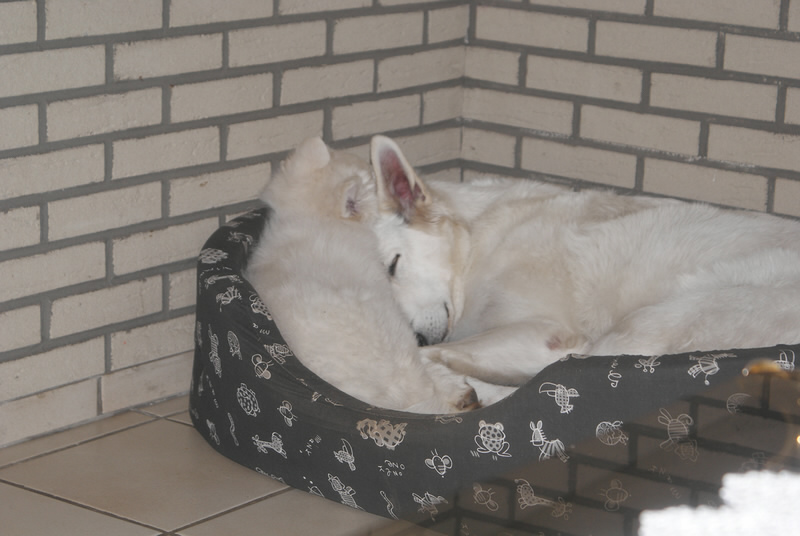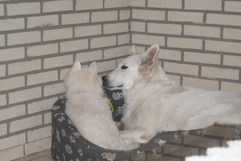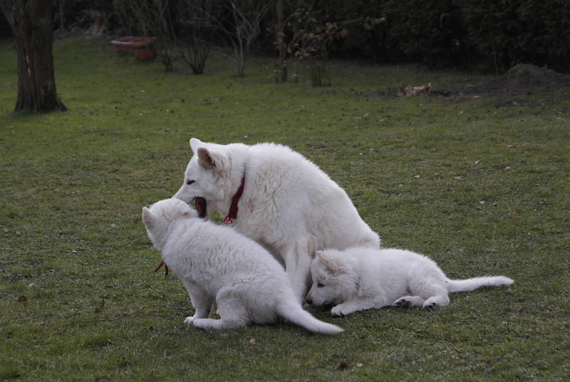 Es sind jetzt schon 5 Welpen weg, zwei Davinia und Destino Jack sind noch bei uns. Destino Jack geht am Samstag in sein neues Zuhause. Die zwei spielen und schmusen mit Mama ganz alleine.