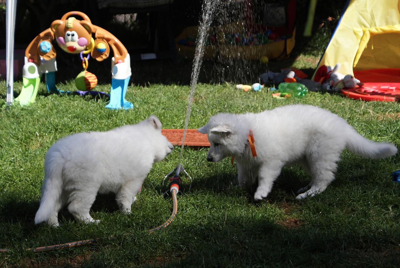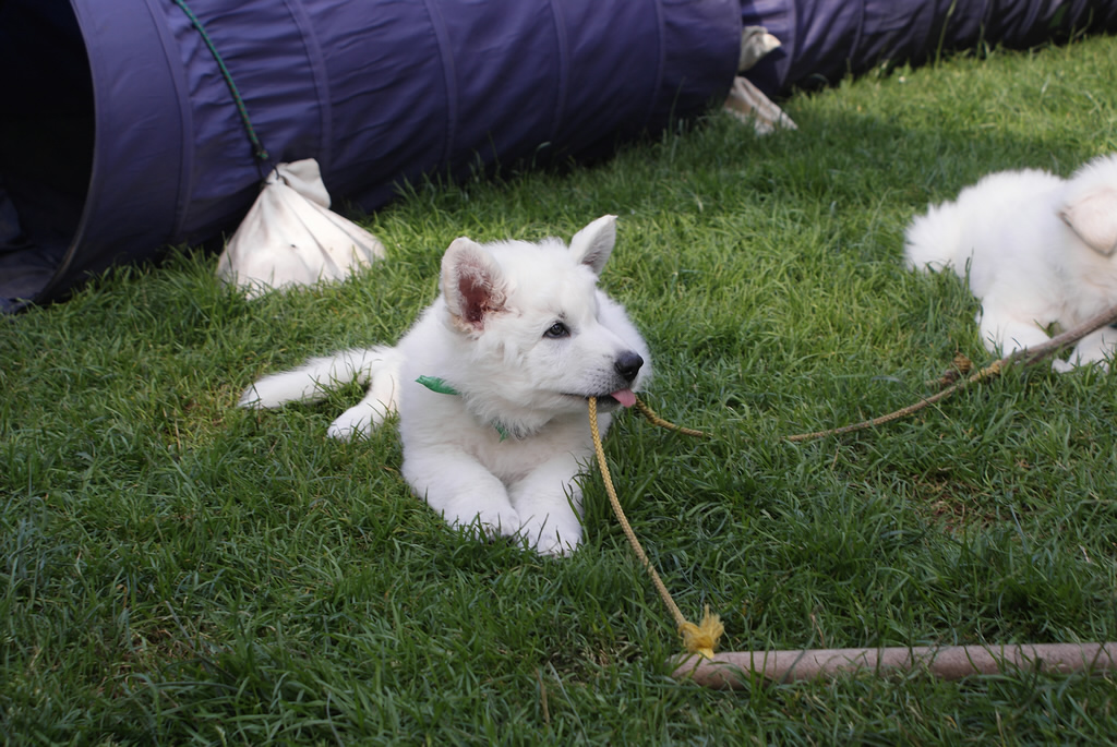 Tag 52 - 58 am 26.06.- 01.07.2015 Hallo in dieser Woche haben wir wieder sehr viel gelernt. Zum Beispiel was ist ein Rasenmäher, wie jeden Tag Auto fahren, an der Leine Laufen, es gab eine Kinderparty das spielen durfte nicht fehlen und auch das Baden. Der Tierarzt war da und jetzt sind wir alle geimpft & gechipt. |