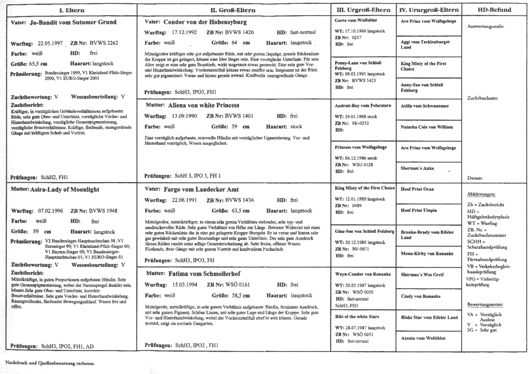 Prämierung: V2 Bundessieger-Hauptzuchtschau 1998, V1 Rheinland-Pfalz-Sieger 2000, V1 Bayern-Sieger 2000, V1 Bundessieger-Hauptzuchtschau 2001, V1 EURO-Sieger 2001